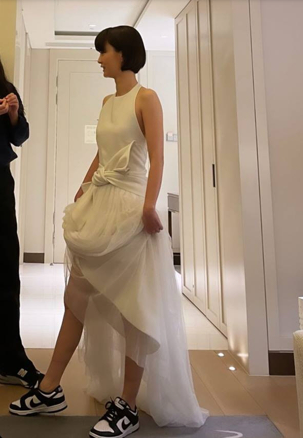 시상식에서 입은 화이트 드레스 아래로는 운동화를 신은 모습으로 실제 무대 위에 신고 올라갔는지는 모르겠지만 대기실에서의 모습으로 보입니다.