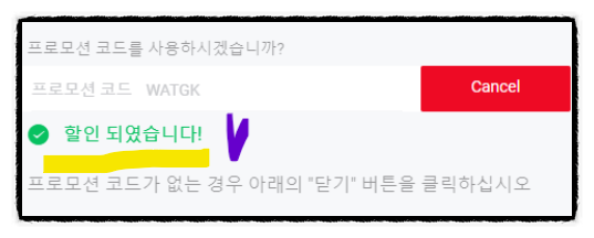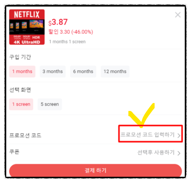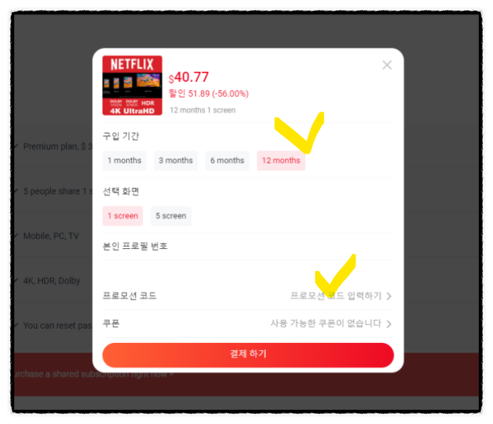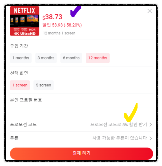 프로모션 코드를 입력하여 할인을 받습니다.저 같은 경우는 1년 계정을 이용해요.그 이유는 매달 구독하는데 연 계정으로 구독하면 더 싸지기 때문입니다.