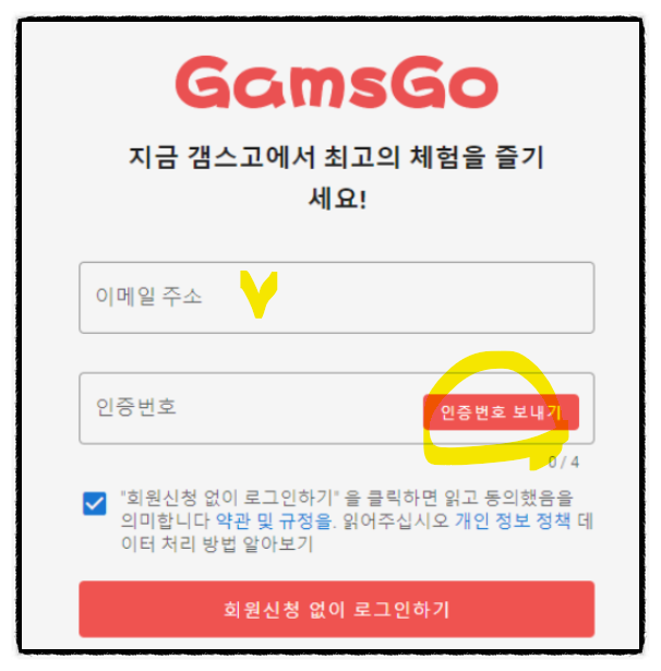2. 본인의 이메일 주소를 입력한 후 [인증번호 보내기]를 클릭하여 입력하고 [회원신청 없이 로그인하기]