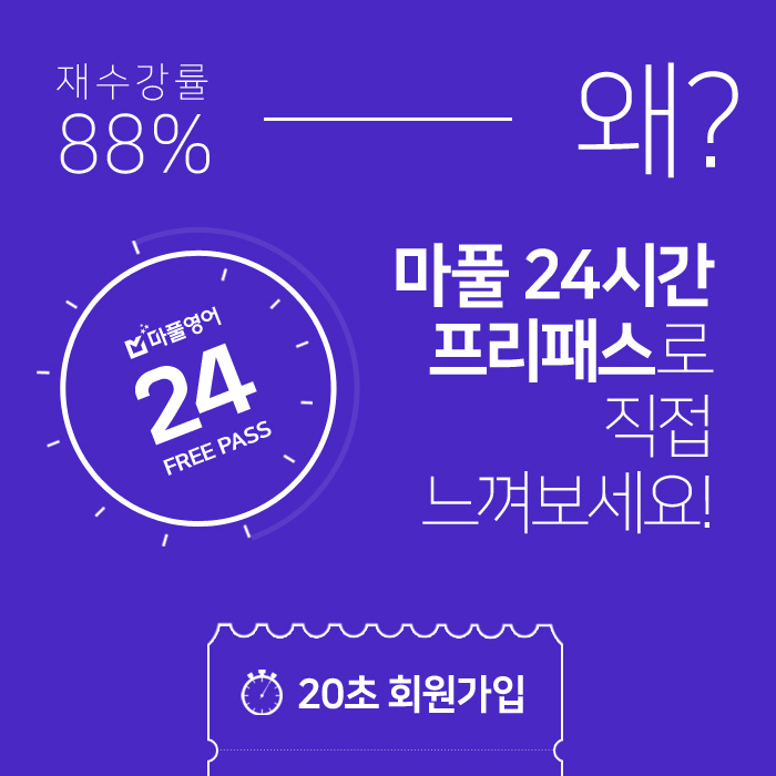 그리고 지금 홈페이지에서는!조승연 비법 영어뿐만 아니라 마플 영어를 24시간 무제한 수강할 수 있는~24시간 자유이용권 이벤트 진행중입니다!