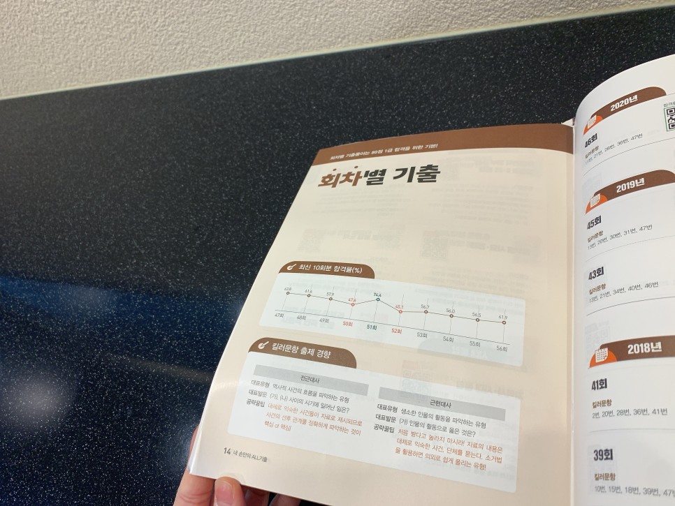 사건에서 중요한 핵심 문제들이 정말 많이 출제됐더라고요그래서 선생님께서도 자세히 내용을 설명해 주셨고 암기 요령도 공유해 주셨습니다. 한국사능력검정시험의 비율을 확인해 보면 전근대사가 근현대사보다 많이 출제되고 그중에서도 고구려와 백제, 신라와 전성기의 구분, 동맹과 같은 고인돌, 영고, 탑 등의 문화재 분류 등이 이뤄졌는데 한국사 기출문제와 함께 해설지도 포함된 교재이기 때문에 인강을 듣고 반복 복습할 수 있다는 점이 가장 마음에 들었습니다.