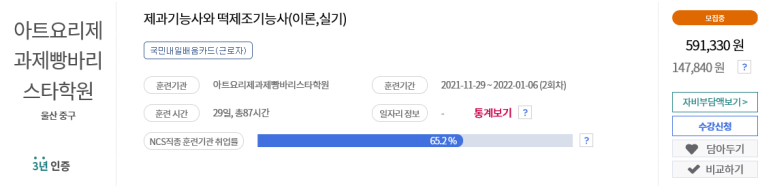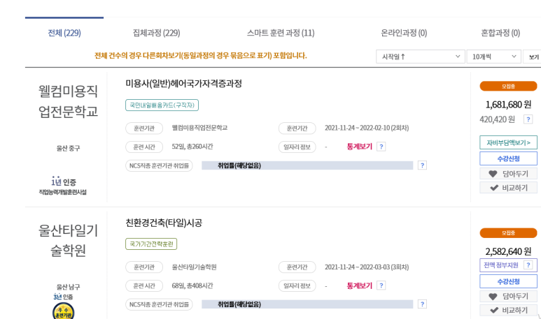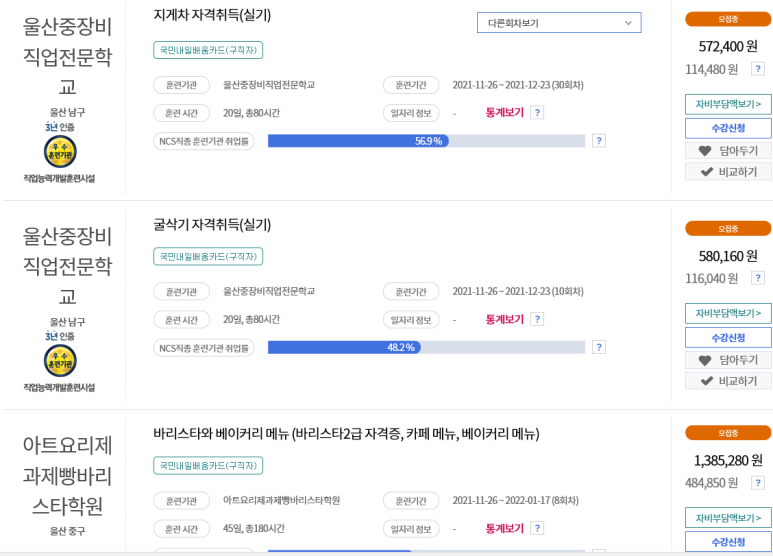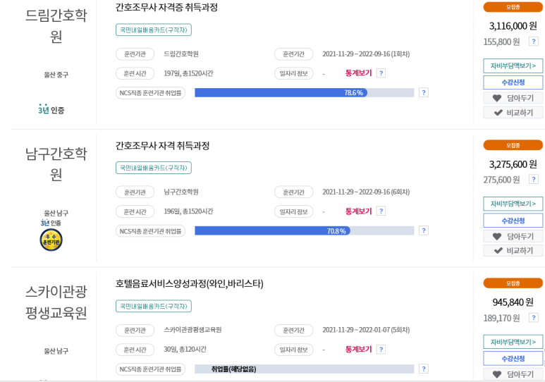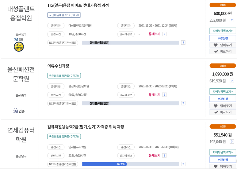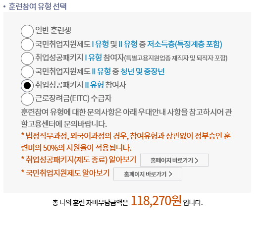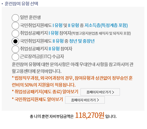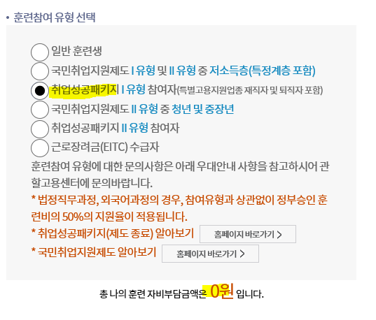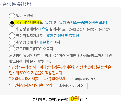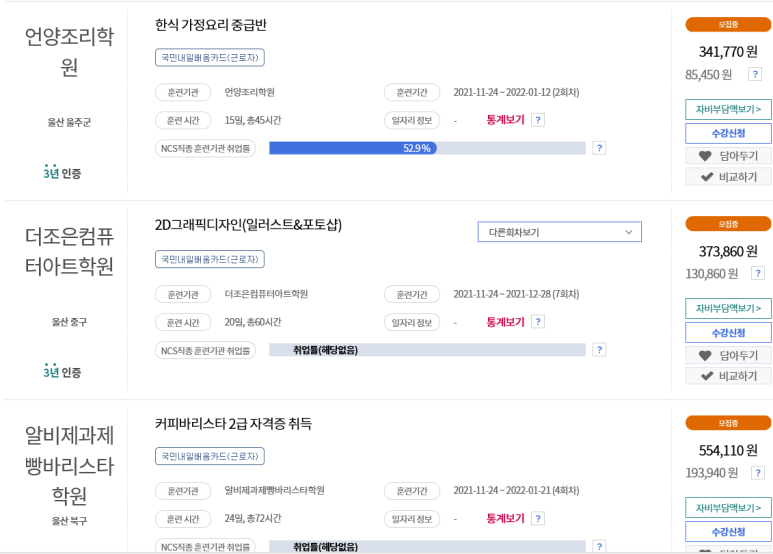 관심있는 수강이 있으면 자비부담액 보기를 클릭해주세요.∨ 총 훈련비 (1) 정부승인 훈련비 : 직종별 훈련비 지원단가를 토대로 승인된 훈련비 정부승인 훈련비 = 직종별 훈련비 정부지원액 + 직종별 훈련생 자비 부담액 (2) 훈련기관 결정 추가훈련비 : 훈련기관을 훈련생에게 추가부담 시키는 훈련비 ex) 591,330원 + 0 = 591, 330