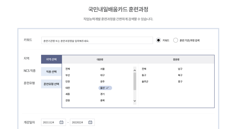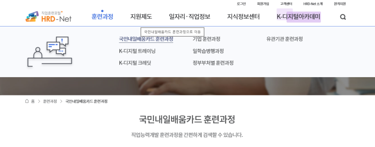 직업훈련포털사이트(HRD-Net)에 접속하여 훈련과정 -> 국민내일배움카드 훈련과정에 접속하세요. ~!