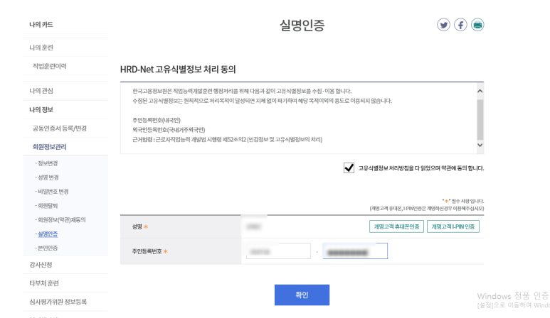 내정보 -> 실명인증 -> 입력 후 확인버튼 클릭