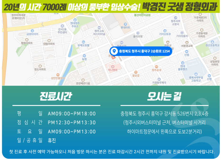본원은 청주 흥덕구 강서동에 위치하고 있으며 독자적인 주차장을 보유하고 있습니다. 최초 내원 시 당일 진료를 도와드리오니 안내해 드리는 진료 시간표를 확인하시고 진료 마감 2시간 전까지 내원하시어 원활한 진료를 받으시기 바랍니다. 감사합니다。