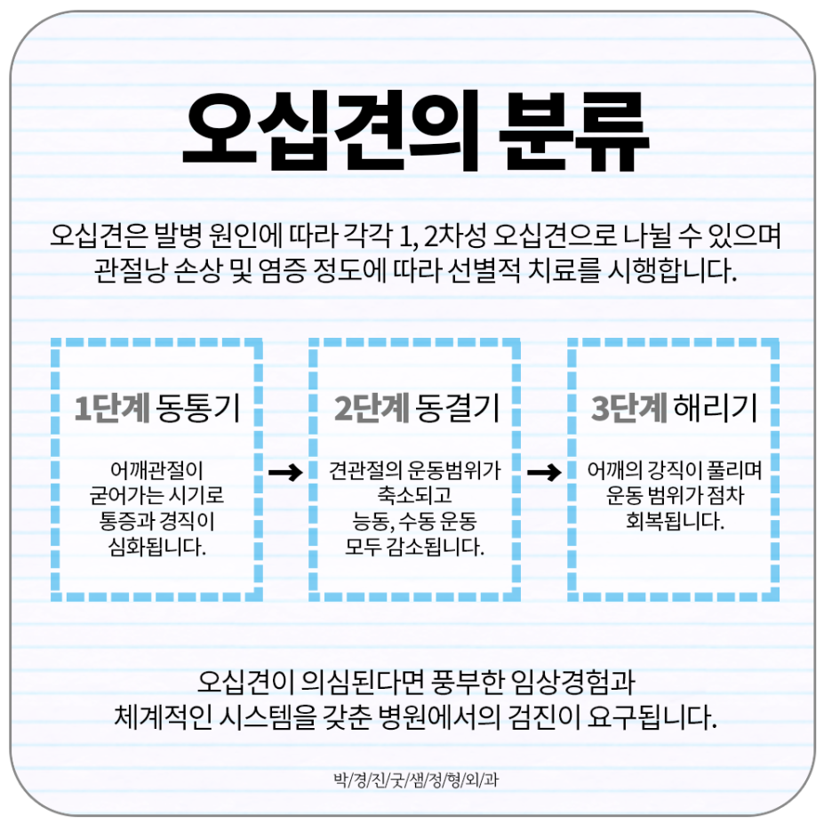 오십견은 총 3단계로 진행됩니다.