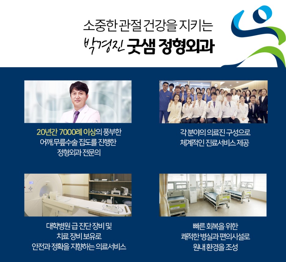 청주 어깨 치료, 관절로 유명한 굿샘은 지난 20년간 7000례 이상의 어깨·슬관절 수술 집도를 진행한 임상 경험을 자랑하고 있습니다. 충청북도의대 정형외과 교수를 지낸 박경진 대표원장과 함께 분야별 의료진 구성으로 체계적인 의료서비스를 제공하는 청주 오십견병원입니다.