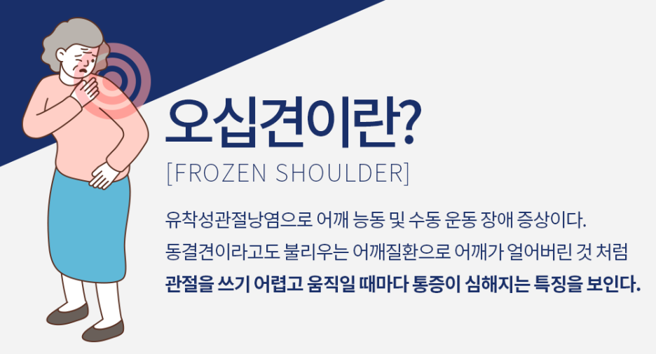 오십견은 어깨 관절의 윤활주머니가 퇴행성 변화를 일으키게 되어 염증을 유발하는 질병입니다. 주로 50대 연령에서 발생하는 특징으로 ‘오십견’이라는 명칭이 붙었고, 다른 병명으로는 동결견이라고 불립니다. 의학적 진단명은 유착성 관절낭염이라고 합니다.