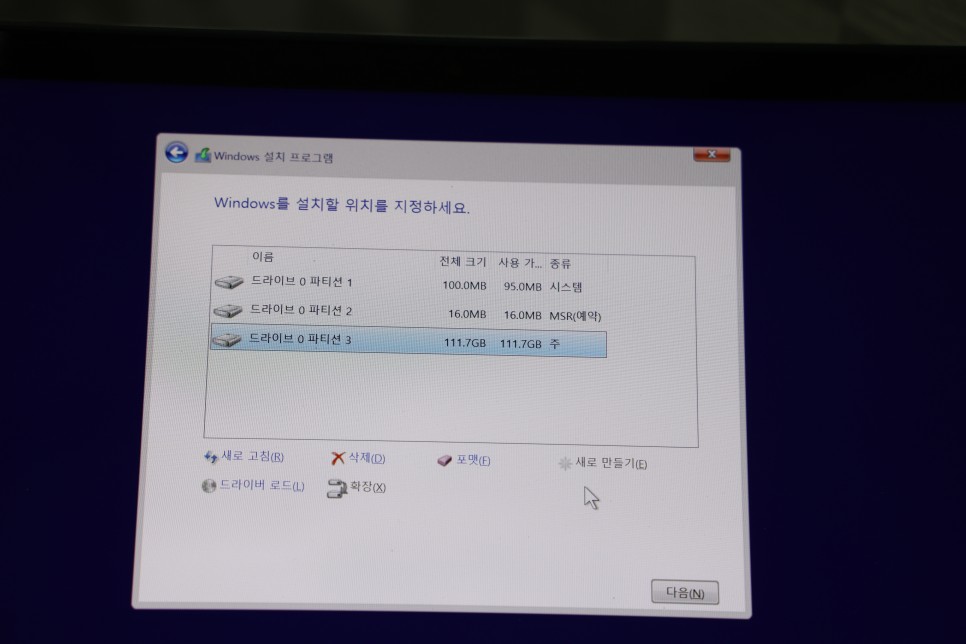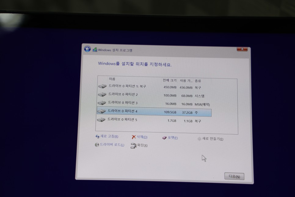 위 사진을 보면 드라이브0을 시작하기 위해 파티션이 여러 개 나뉘는데 128GB SSD 하나만이 탑재된 노트북이다.