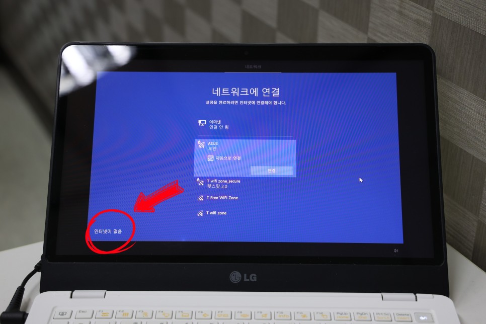 한 가지 요령을 알려주면 Win dows 설치 과정 중에 네트워크 접속을 하는 단계가 나오는데 왼쪽 하단에 인터넷이 없다를 넣는 것이 좋다.