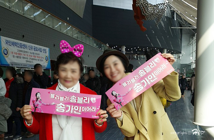열렬한 송가인 팬 데어울의 어머니를 위해 머리띠를 하나 샀다.플랜카드는 팬클럽에서 나눠준 것미스트로 참가한 가수들은 각각 팬클럽이 형성돼 있어 가수별로 플래카드를 나눠주거나 조를 짜 응원복에 응원도구를 들고 다니는 사람도 많았다.정말 요즘 미스트롯의 인기가 대단하다는 것을 눈앞에서 실감하는 순간이었다.엄마랑 한명씩 번갈아 기념사진도 찍고.. 너무 좋아하시는 엄마를 보면 딸도 너무 좋고~