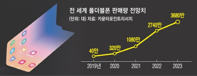 ■휴대용 폰, 대중화란?당초 삼성전자는 폴더블폰 출시를 계기로 세계적으로 100만 대가량 팔릴 것으로 봤으나 출시 지연 등으로 50만 대가 팔릴 것으로 보고 있다. 시장조사업체 카운터포인트리서치는 글로벌 폴더블 스마트폰 전망 보고서에서 올해 폴더블폰 판매대수를 당초 190만대에서 80% 줄어든 40만대로 예상했다.내년 전망은 다르다. 카운터포인트리서치는 내년에 올해의 8배 수준인 320만 대 출하를 예상했다. 화웨이가 내년에 유럽 등에서도 판매를 시작하면 스마트폰 시장에서 폴더블폰의 시장점유율이 갈수록 높아질 것이라는 전망도 나온다.폴더블폰 성공을 점치는 이들은 폴더블폰을 아이폰 초기와 비교하기도 한다. 아이폰 초기 모델도 이미 포화된 시장에 진출해 고가였지만 이를 극복했다는 것이다. 최보영 교보증권 연구원은 “아이폰1도 부정적인 시선이 많았지만 급진적 디자인, 혁신적 기능을 선보였고 소비자들이 이에 열광했다”며 “삼성전자와 화웨이, 샤오미 등 후발주자들이 참여하면서 스마트폰 시장은 21세기 혁신의 아이콘이 됐다”고 말했다. 그는 “갤럭시폴드 성공 후 화웨이, 모토로라 등 후발 주자들의 참여로 폴더블폰 시장 확대가 예상된다”고 말했다.한편으로는 폴더블폰을 향한 의문이 가시지 않고 있는 것도 사실이다. 전자업계 관계자는 “스마트폰의 핵심은 편의성, 휴대성이지만 이것이 채워지지 않는 스마트폰이라면 비싼 가격에 살 수 있을 만큼 큰 유용성이 있다고 본다”고 말했다. 결국 얼마나 가격이 낮아지느냐가 관건이다. 현재 갤럭시폴드의 가격은 239만8000원이다. 전자업계에서는 내년에 나올 조개 모양의 폰 폴더블폰을 100만원 후반대로 예상하고 있다./ 임지성 기자 [email protected]