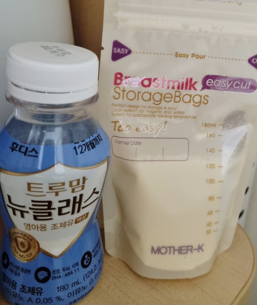 액상분유 180ml 110ml 마신 적도 있지만 보통 40ml~90ml 마신다-72일 아기 90ml 모유 저장팩에 넣어 냉장 보관한다