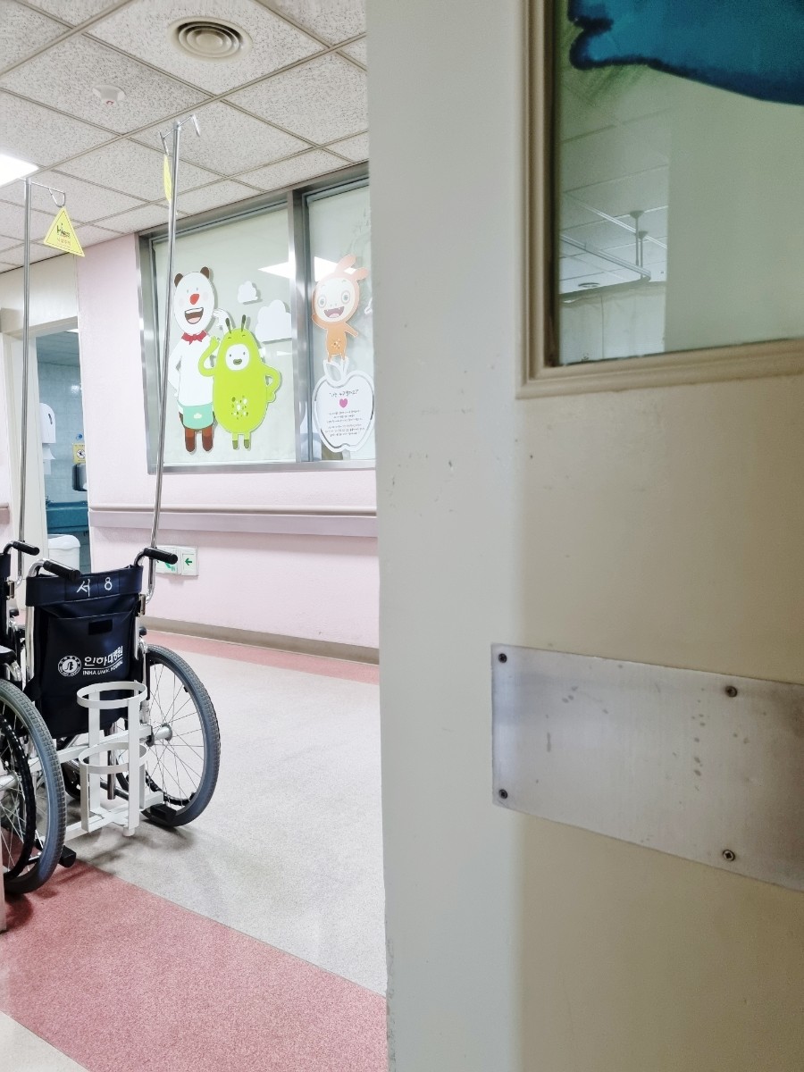 유모차가 없다. 휠체어만 줄지어 있다.유모차도 가져가지 않고 발에 링거를 맞고 코니악키티도 어려워서 꼭 안아주는 진통제를 먹고 아기를 돌본다.