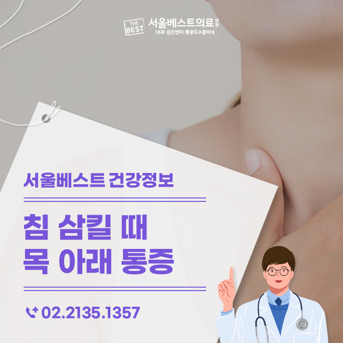 목 윗부분 통증은 편도와 후두 문제가 의심되지만 목 아랫부분, 즉 목 아랫부분 통증이 있으면 갑상선의 문제일 수 있으므로 갑상선 질환 여부를 확인하기 위한 정확한 검진을 받아보시기 바랍니다.침을 삼킬 때 목 밑에 통증이 있나요?청구역 내과 서울베스트의료의원