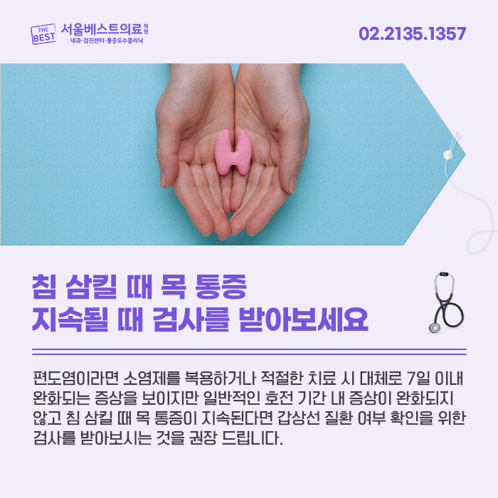 침을 삼킬 때 인후통이 아니더라도 음식을 삼킬 때 인후통이 있다면 갑상선결절이나 갑상선 관련 질환을 의심할 수 있으므로 방치하지 말고 정확한 진단을 통한 치료를 위해 가까운 병원에서 갑상선 검사를 받는 것이 좋습니다. ^^ 침을 삼킬 때 인후통이 지속될 때 검사를 받아보세요 청구역 내과 서울베스트의료의원