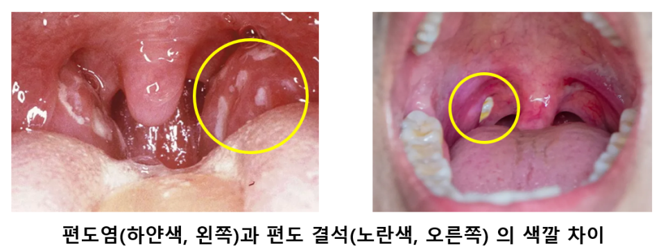- 2. 색급성 편도염의 경우 주로 백색 삼출물이 관찰됩니다. 한편, 편도 결석의 경우는 노란색 덩어리로 보이지만, 사진에서 언뜻 보면 흰색 같지만, 잘 보면 노란색으로 되어 있는 경우가 많습니다. 직접 아래의 사진으로 비교해 보겠습니다.