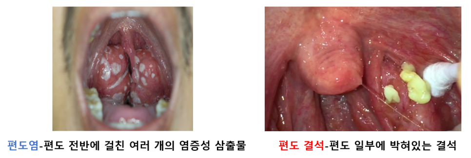 - 원인 급성 편도염의 경우 주로 세균(박테리아) 감염이 원인이 됩니다. 감염에 의해 염증이 생기며 염증에 의한 흰 삼출물이 편도 전반에 걸쳐 나타납니다. 한편 편도 결석의 경우 음식물 찌꺼기, 칼슘 등이 축척되어 하나의 덩어리를 형성하는 것입니다.
