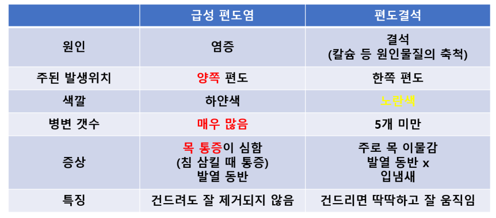 안녕하세요, 오늘은 많은 분들이 가끔 혼란스러워하는 편도결석과 편도염 소견에 대해서 이야기를 나눠보도록 하겠습니다. 제가 주로 활동하는 지혜주머니에서도 간혹 편도염 소견을 편도결석으로 오인하여 결석을 제거하려다 실패했다는 질문이 있습니다 급성 편도염의 경우 항생제와 진통 소염제의 복용이 필요하므로 이 두 질환을 잘 구별하는 것이 중요하다고 할 수 있습니다.급성 편도염과 편도결석에 대한 자세한 내용은 블로그 목 질환 정보에 각각 정리되어 있으니, 그 글을 참고하시기 바랍니다.오늘 이 글에서는 두 질환의 차이와 눈으로 봤을 때 어떻게 구분할 수 있는지에 대해서 정리해 보도록 하겠습니다. 마지막부분에 표에 정리되어 있는 것이 있으니 바쁘신 분들은 맨 아래 표만 숙지하시기 바랍니다.