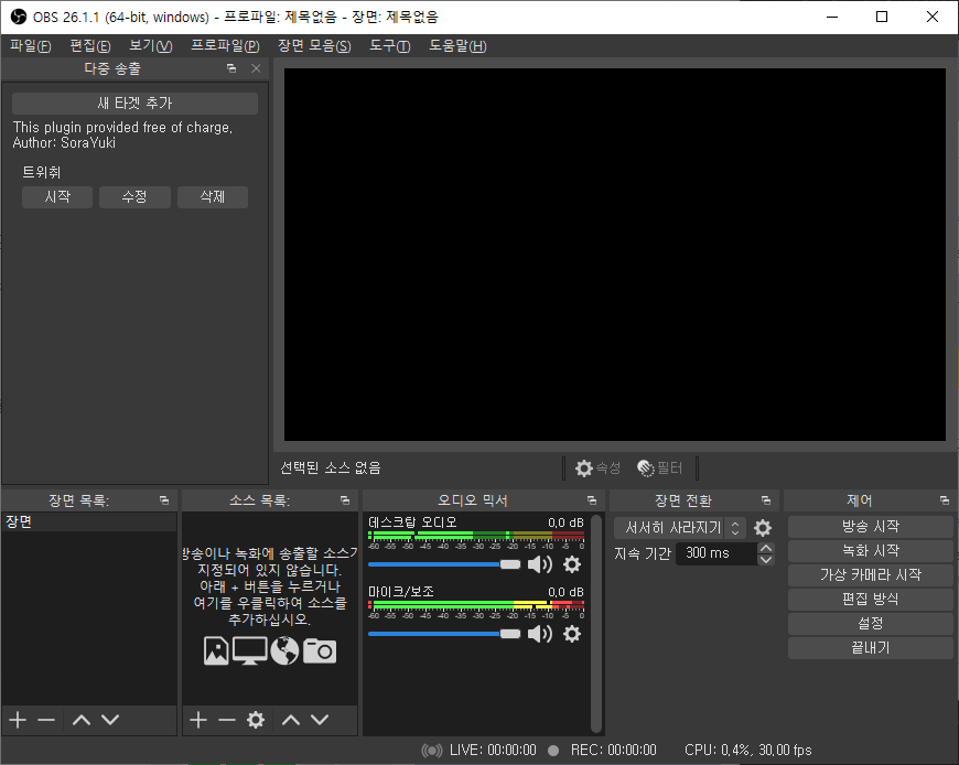 그대로 OBS 스튜디오를 실행하면 왼쪽에 다중 송출이라고 하는 소스를 확인할 수 있습니다. 🙂