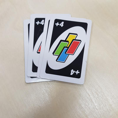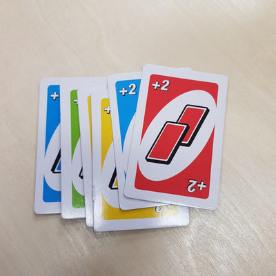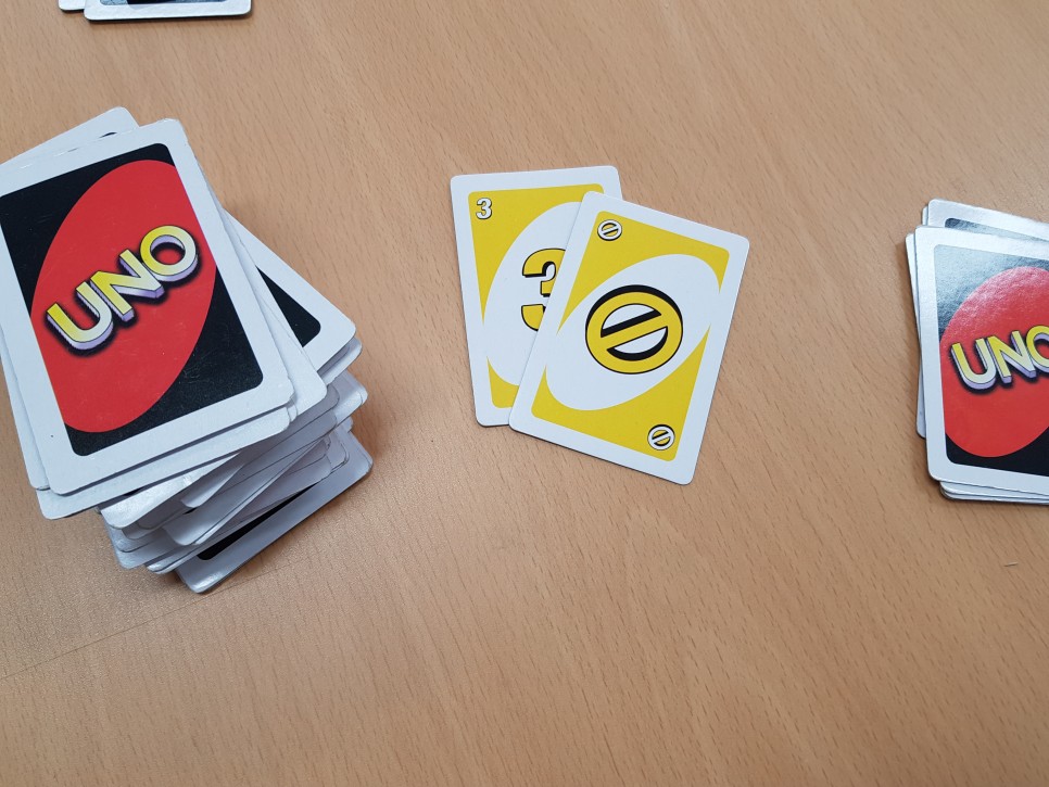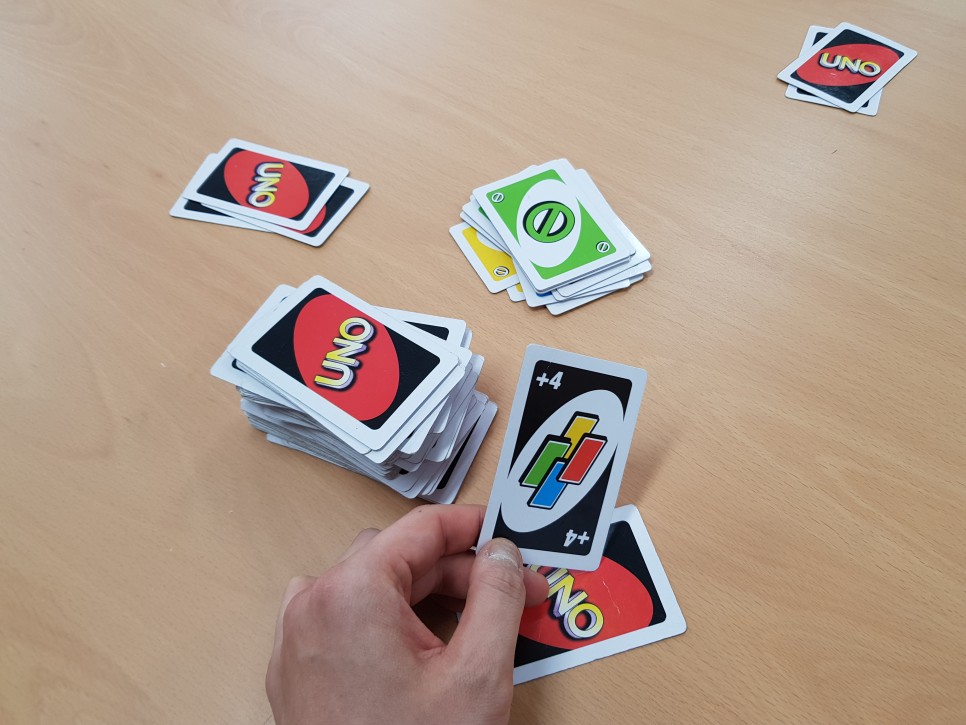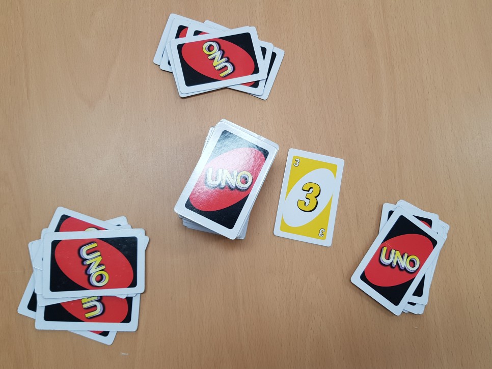 드로2 카드 드로카드는 폭탄이라고 생각하면 된다.이전 카드와 맞는 색을 사용해야 하니 다음 턴 사람이 2장을 받게 된다.드로우 카드를 방어할 수 있는 드로우 2카드, 와일드드로 4카드만! 그러면 폭탄 돌리기가 시작되는 거군요.(웃음)