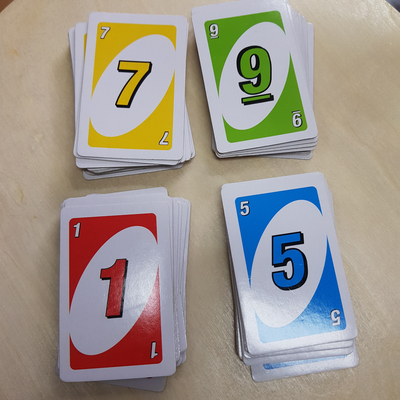 기본 카드 기본 숫자 카드에는 0~9까지 적힌 4색 카드가 있다.원카드를 할 때 네 가지 무늬가 있는 거랑 같은 원리일 것 같아