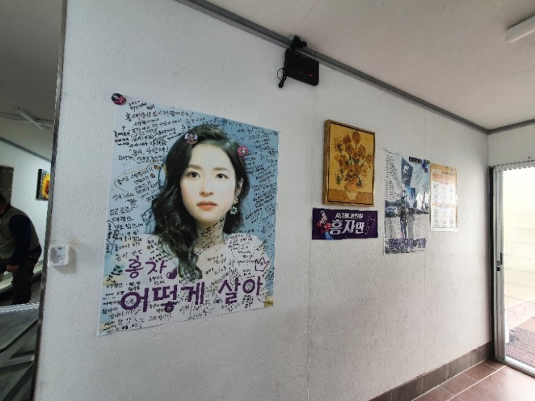 연보랏빛 사진이 군데군데 걸려 있다