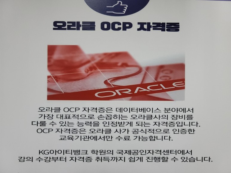 OCP는 SQL 오라클 국제공인 자격으로 DBMS(데이터베이스 관리시스템)를 설계-구축-운영할 수 있는 실무능력 인증자격으로