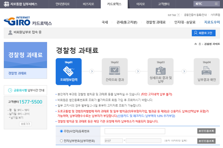 인터넷으로도 본인에게 부과된 범칙금이나 과태료를 지불할 수 있습니다.그리고, 신용카드 납부 수수료는 결제금액의 0.8%라고 합니다.신용카드 대신 체크카드로 결제할 경우에는 수수료율이 0.7%로 좀 낮다고 합니다.
