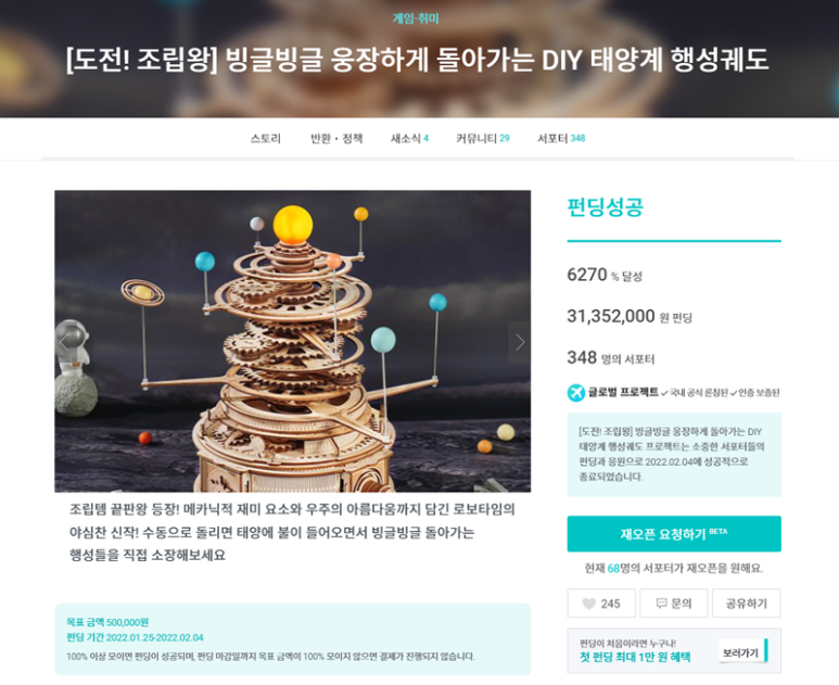 와디즈 펀딩을 돌아다니다가 여기 ROKR이 있었어요.심지어 불도 켜지고 행성들이 빙글빙글 돌아가는 게 너무 예뻐요.ㅎㅎㅎ