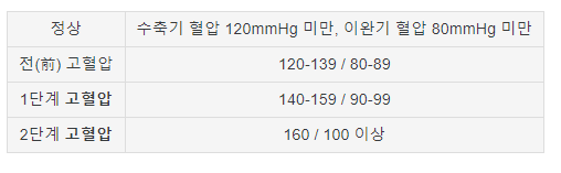 출처 – 나무위키 고혈압 정상수치는 수축기 혈압 120 미만이 완기 혈압 80 미만이지만 혈압 정상수치가 오르면 단계별로 전 고혈압, 1단계 고혈압, 2단계 고혈압으로 나뉩니다.