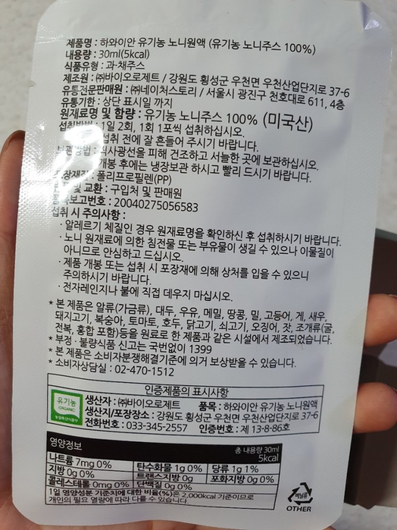 최근 간혹 다른 과즙과 섞여 나오는 제품도 있는데 구매 시 꼭 100% 노니 원액인지 확인하시기 바랍니다.^^ 데일리원 제품은 100% 냉압착 원액으로 신선하며 영양소 파괴를 최소화 했다고 합니다