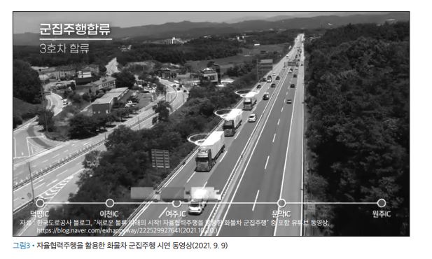 지난 9월 초 국토교통부는 2018년부터 추진해온 자율협력주행 기반 화물차 군집 주행기술 개발 성과를 발표하고 실제 화물자동차 4대의 자율협력 군집 주행을 시연했다. 영동선 덕평IC원주IC, 중부내륙선 서여주휴게소여주JC까지 약 80km 구간에서 진행됐다. 지난해 시연에 비해 군중 주행 대상 차량 대수, 시연 구간 거리, 운행 속도를 모두 늘리고 차량 간격을 줄이는 등 한층 발전된 기술 성과를 보여 군중 주행 기술의 상용화 가능성을 제시한 것으로 평가된다. 유럽 미국 등 선진국들이 오래전부터 기술을 발전시켜 온 것에 비하면 매우 빠르게 따라잡는 셈이어서 향후 기술진보 속도도 기대된다.