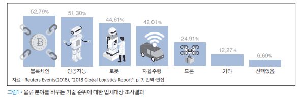 화물부문 자율주행기술의 발전 물류서비스를 제공하는 주요 기업을 대상으로 Reuters Events가 실시한 조사 결과 1)는 블록체인, 인공지능, 로봇, 자율주행, 드론 등이 현재 물류 분야의 판도를 바꿀 대표적인 기술로 꼽히고 있음을 보여주고 있다.
