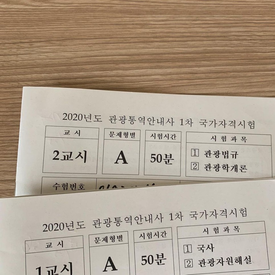 1차 시험입니다 외국어 필기 시험은 공인어학 시험을 대체합니다 원서접수에 외국어 각 공인어학 시험인증서를 제출해주세요. 시험은2교시4과목시험으로객관식1교시는국사,관광자원해설,2교시는관광학개론과관광법규로이루어져있습니다. 100점 만점에 평균 60점 이상 있어야 됩니다. 40점 이하의 과락이 있어요. 다른과목은배점이20%인데한국사배점은40%이기때문에한국사에집중적으로공부를해야합니다.