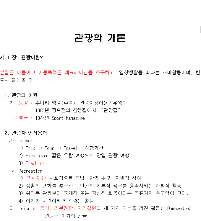 정리파일 입니다. 한국사를 제외한 관광학 개론, 관광 법규, 자원 해설을 요약해 놓은 것입니다. 이런시험들은기존방식과문제형태가크게다르지않기때문에충분히오답을잘암기해도그렇게어렵지않아요.