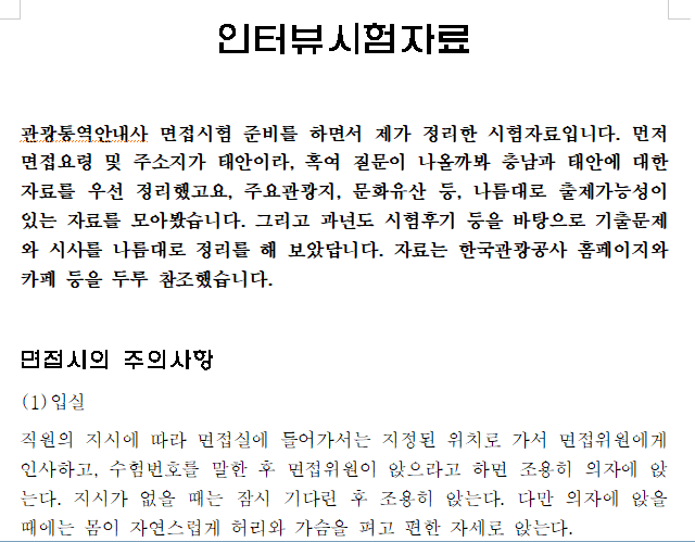 관광통역사 면접 정리 자료를 올려놓겠습니다 참고하여 활용하시기 바랍니다. 이상으로 저는 관광통역안내사 자격증 필기, 후기 실기 정리파일 기출문제 pdf 포스팅을 마치도록 하겠습니다. 안녕하세요!!