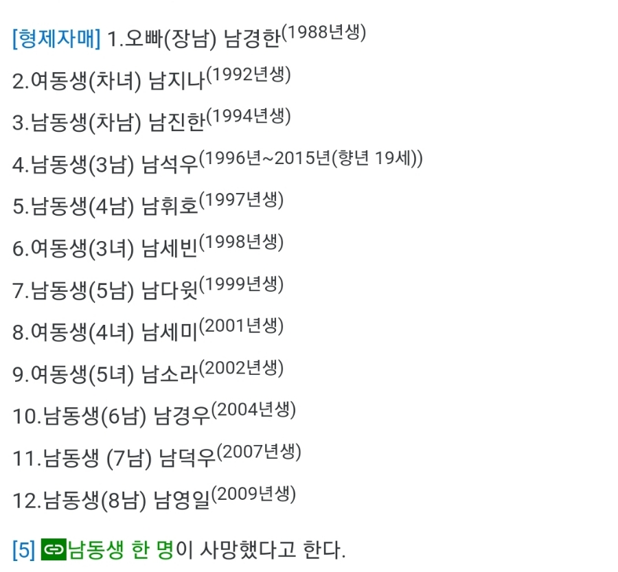 그리고 2015년 남보라의 동생이 사망했다는 소식이 전해졌습니다.정확한 사망 원인과 시점은 알려지지 않았습니다.