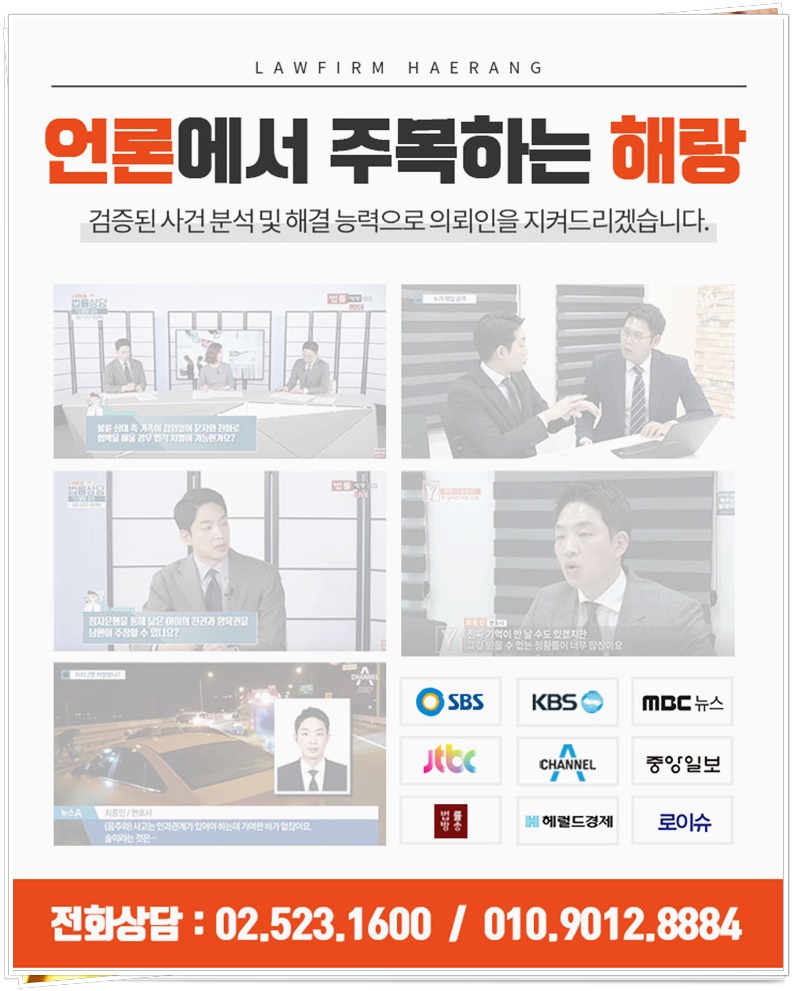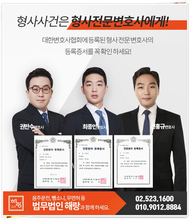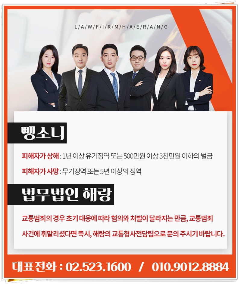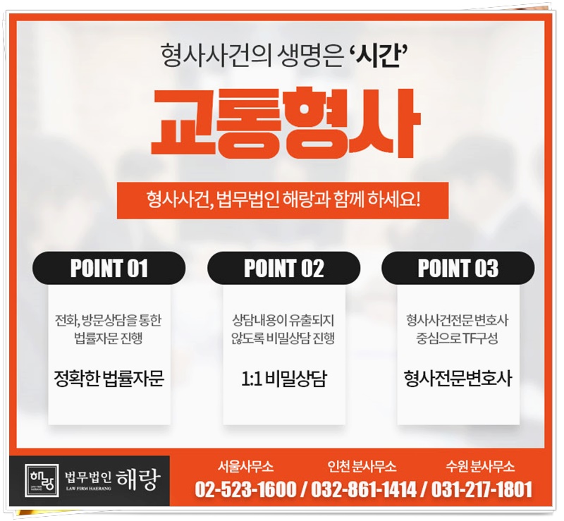02.523.1600 / 032.861.141.217.1801 전문적인 사건일수록 대처방법도 특별해야 합니다. 대한민국 소비자 만족도 1위의 법무법인 해랑교통사고담당팀은 풍부한 경험, 탁월한 통찰력, 차별화된 법률서비스로 최상의 결과를 약속드립니다.blog.naver.com 서울법무법인 / 수원법무법인 / 인천법무법인 / 서울변호사 / 수원변호사 / 인천변호사 / 교통사고 사망 / 교통사고 중상 / 교통사고 개호 / 교통사고 중상해, 교통사고 전담팀 운영 trafficlaw.co.kr