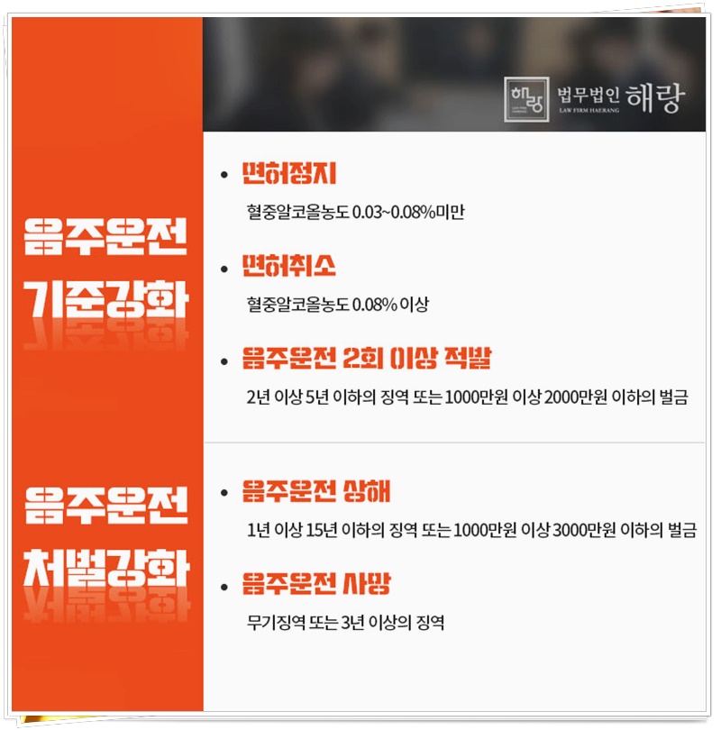 이런 상황에서 휴가 중인 군인을 음주운전 차량이 치어 숨지게 하는 사건이 발생하고 음주운전 적발 및 처벌을 강화해야 한다는 여론이 들끓어 결국 도로교통법과 윤창호법이 개정되고 처벌 기준이 과거에 비해 상향 조정돼 처벌이 매우 엄격해진 것입니다 그래서 강화된 음주운전 처벌로 형사처벌을 받는 것보다 현장에서 도주하는 것이 낫다는 잘못된 생각을 하는 운전자들이 늘어난 거죠. 그러나 음주 뺑소니 처벌은 죄질이 나쁠 뿐 아니라 우리나라는 CCTV와 블랙박스 보급률이 워낙 높아 검거율이 97%에 이릅니다. 그래서 도주 자체가 무의미하며 검거되면 각각의 혐의에 대해 처벌을 받기 때문에 재한 처벌을 더 받기 위해 현장을 떠나거나 도주하는 행동을 절대로 해서는 안됩니다.