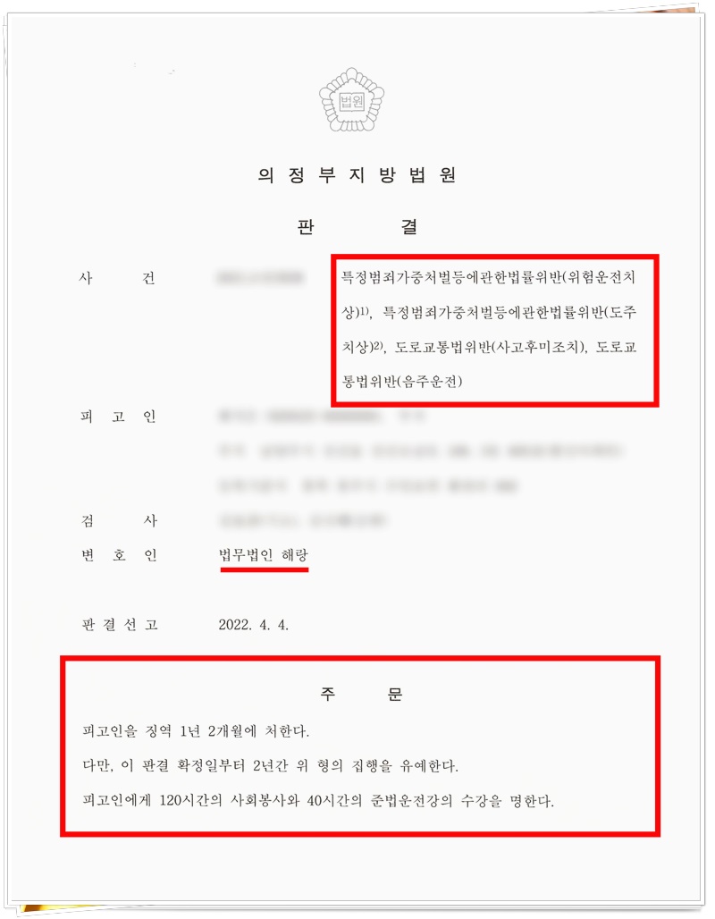 다른 해랑에서 수임한 음주비탈 사례를 소개합니다 의뢰인은 2020년 7월, 술을 마시고 운전 중에 앞쪽 차량에 강한 충격을 주어 피해자에게 전치 8주의 중족골절상, 치아 탈구상을 입혔으나 아무런 조치도 취하지 않고 도주했습니다. 이후 의뢰인은 CCTV를 통해 뺑소니 사실이 확인돼 경찰에 소환됐는데 대리운전사가 운전 중 사고를 내고 자신은 자고 있어서 몰랐다고 속이다가 경찰이 증거로 CCTV 영상을 증거로 제시하자 그제서야 범행을 시인했습니다. 의뢰인은 2016년 6월 음주운전으로 처벌받은 전력이 있는데도 음주운전으로 사고를 내 도주한 것으로 비록 음주운전으로 기소되는 것은 막았지만 위드마크 공식 적용 결과 혈중알코올농도 0.175%로 추정되고 만취상태였음이 확인되어 명백한 증거가 있는데도 뻔뻔스럽게 거짓말을 하고 CCTV 영상을 증거로 제시한다고 합니다.