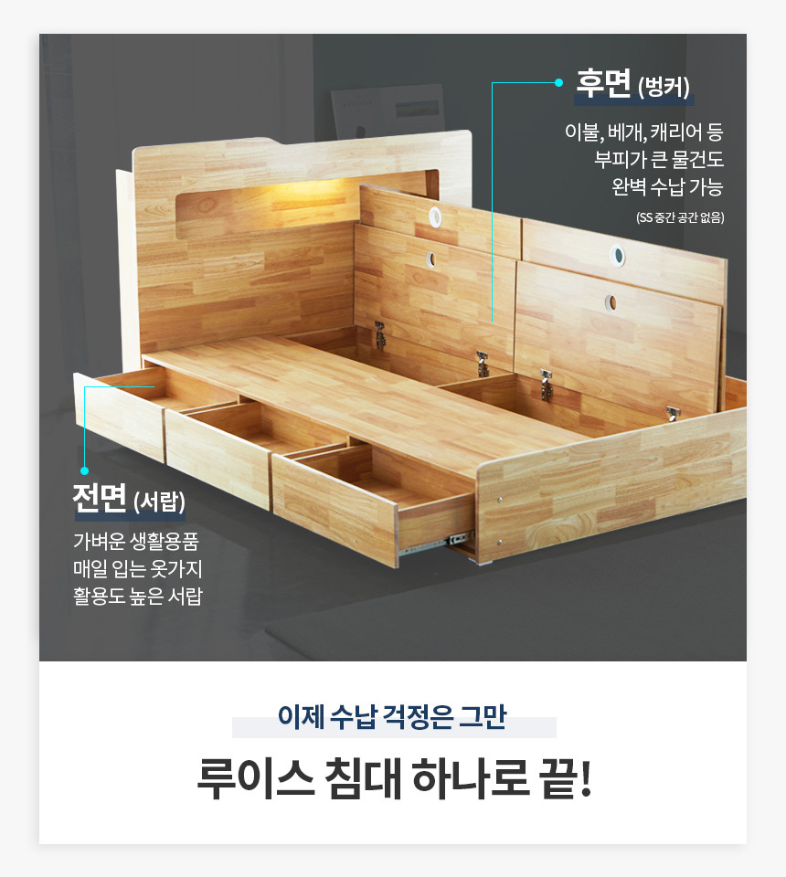 규격은 퀸사이즈로 1520*2158*1040이며 바닥평면높이가 418로 높은 수납침대입니다.418 모델은 일반 매트리스 260-300 정도를 사용할 경우 식탁의 높이가 너무 높아 불편하실 수 있으나 고객님께서는 의료용 매트리스를 사용하시고 넉넉한 서랍공간이 필요하여 418 모델을 선택하시고 대형 서랍이 필요하여 머리쪽 서랍함은 1단으로 제작하였습니다.나중에 다른 방향으로 사용할 경우를 대비해서 양측은 2단에 가운데를 1단으로 제작하자고 논의했습니다. 손님이, 손님이, 손님이, 손님이, 손님이.