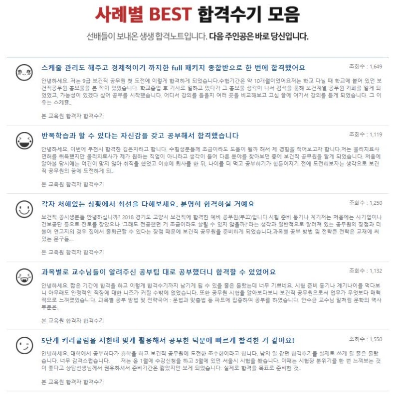 저도 실제로 수강생이 있는 강의의 경우 잡음이 발생할 수밖에 없어 집중력에 방해가 되었지만 시선을 맞추는 느낌이 드는 것은 물론 다른 자음이 발생하지 않아 집중력을 유지하는 데 도움이 되었다고 생각합니다. 나아가 학습을 진행하면서 발생하는 궁금한 부분을 바로 질문할 수 있었고 교수님이 직접 작성한 답변을 받을 수 있어 낭비되는 시간 없이 주어진 시간을 공부에만 활용할 수 있었습니다. 이렇게 9급 보건직 공무원의 온라인 학습에 최적화된 학습 시스템을 활용하여 주어진 시간을 최대한 활용한 덕분에 최종 합격까지 갈 수 있었다고 생각합니다.