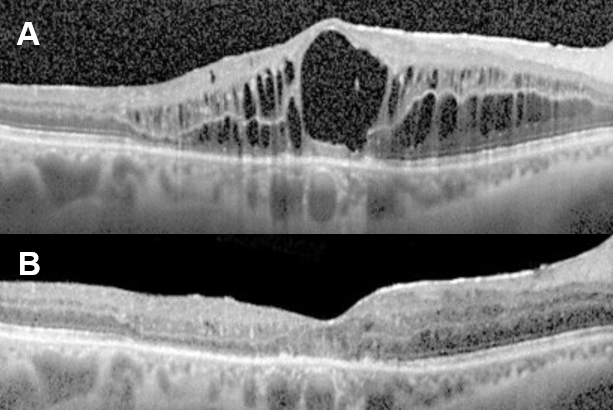 그림 3.(A) 주사 전 CME, (B) 덱사메타손 플랜트 삽입술 후 6개월 – 호전된 CME ᅥᆫ시 投与 전신 투여 – 먹는 약 또는 정맥 주사 : 부작용 위험이 크므로 주의하십시오.