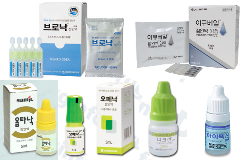 2) 비스테로이드성 항염증제(Nonsteroidal Anti-Inflammatory Drugs;NSAIDs) ① 작용 원리: Cyclooxygenase(COX) 활동을 막고 프로스타글란딘(PG) 합성을 억제합니다.② 국소(점안) 용법: 눈 안 침투력이 강해 전신적인 부작용이 적고 우선적으로 사용합니다.* 스테로이드 안약과 함께 사용: 병용하지 않으면 약 50%에서 재발한다는 보고가 있습니다.③ 브로낙(Bromfenac, 대준제약), 아큐베일(Ketorolac, 엘러간), 옵태낙(Diclofenac, 삼일제약-삼일 외에도 디크로페낙 약제는 여러 회사에서 만듭니다) 등의 안약이 있습니다(그림 4).