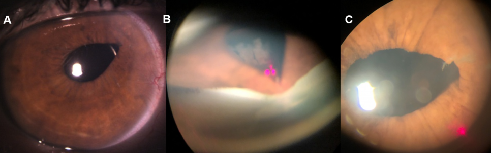 그림 5. (A)절개창에 끼워져 있는 유리체(Vitreous incarceration, Vitreous winksyndrome), (B)야그레이저 광원에 끼워져 있는 절개창을 조준하였으며, (C)야그레이저 조사 후 절개창에 끼워져 있던 유리체는 풀렸습니다.2) 유리체절제술(그림6) ① 절개창(창상) 내 또는 홍채와의 유착된 유리체 제거 ② 기존 유리체 제거 → 염증매개물질이 포함되어 있던 유리체를 제거함으로써 염증반응 감소 + 눈 깊은 내부로 약물 침투를 좋게 할 수 있습니다.③ 수술은 CME가 2개월 이상 지속됐을 때 시도해 볼 수 있지만 수술 자체가 가진 위험성과 수술 후에도 시력 호전이 없을 수도 있다는 사실을 반드시 환자에게 충분히 설명해야 합니다.
