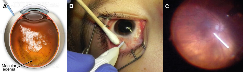 그림 1. (A)테논난하트리암시놀론(Sub-Tenon Triamcinolone) 주입술, (B) 주사 전 CME, (C) 주사 2개월 후 호전-중심 오목 형태가 유지 중 ④ 유리체강 내 주사 ⑤ 트리암시놀론(Triamcinolone, 그림 2-A) : 혈액망막 장벽(Blood Retinal Barrier; BRB) 파괴를 감소시킵니다.* 재발성 CME에 유용하지만 효과가 일시적이기 때문에 일정 기간이 지나면 재발합니다. →효과를 유지하기 위해서는 여러 번 주사를 맞아야 합니다.㉡ 덱사메타손 삽입물(Dextamethasoneimplant; Ozurdex®, 그림2-B&C): 보다 효과가 오래 유지되지만 여전히 재발로부터 자유롭지 못합니다.