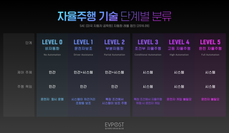 레벨 2까지는 시스템이 보조적 역할에 머무르면 레벨 3부터는 시스템이 운전하고 사람이 보조하게 됩니다.
