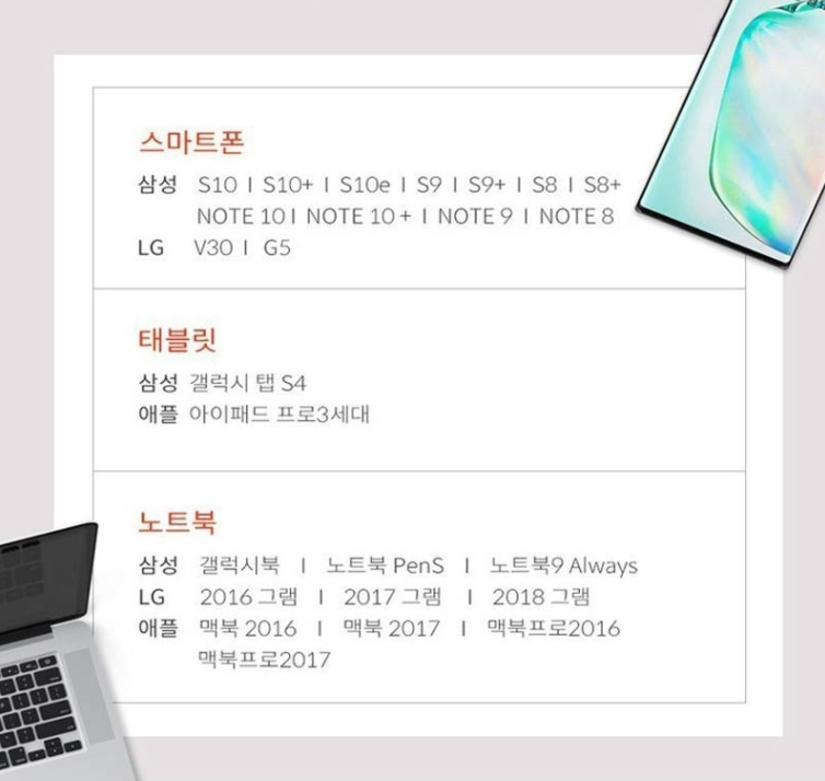 제품의 전면과 후면입니다.스마트폰 단자는 C타입입니다.C타입이 지원되는 스마트폰 중 아래 사양의 스마트폰과 태블릿, 그리고 노트북에서 사용할 수 있는 제품 모델입니다.