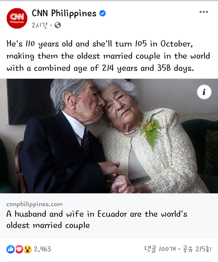 CNN Philippines의 기사지만 기사의 주인공은 에콰도르 커플이다. 할머니 정말 귀여워요:) 세상에서 가장 오래 해로한 장수 커플, 그들의 이야기를 스페인어 기사로 찾아봤다. 에콰도르 분들이니까 에콰도르 신문 기사에서 픽